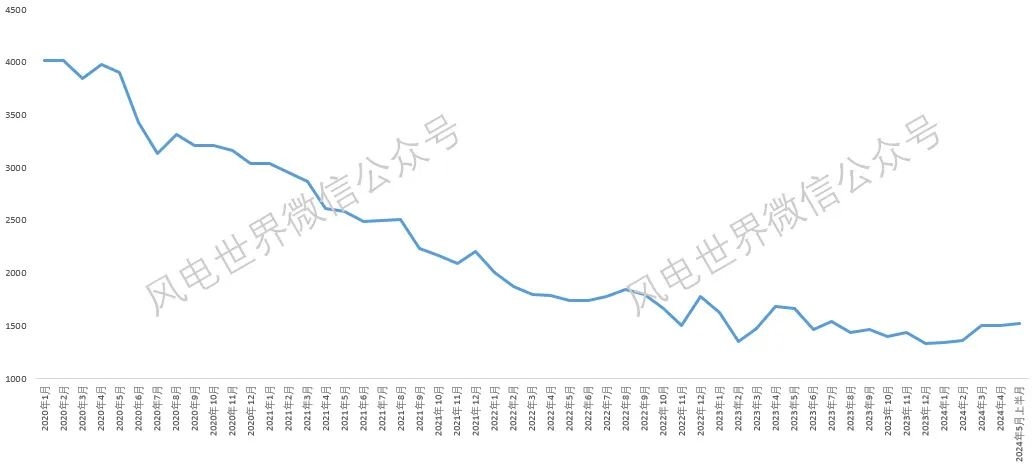 据风电世界积累数据显示,进入2024年以来,陆上风电主机(不含塔筒)价格保持稳中有升的趋势,基本站稳在1500元/千瓦上下。
