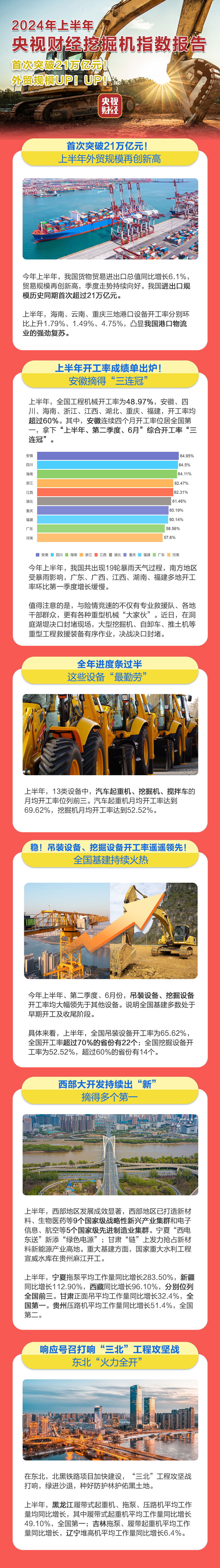 挖掘机是基础设施建设的“标配”,是反映基础设施建设、观察固定资产投资等经济变化的风向标。央视财经与三一重工、树根互联联合打造的“央视财经挖掘机指数”发布了最新相关数据。今年上半年,我国货物贸易进出口总值同比增长6.1%,进出口规模历史同期首次超过21万亿元,多地港口设备开工“火热”,港口物流业强劲复苏。
