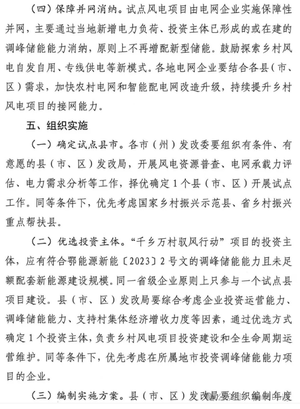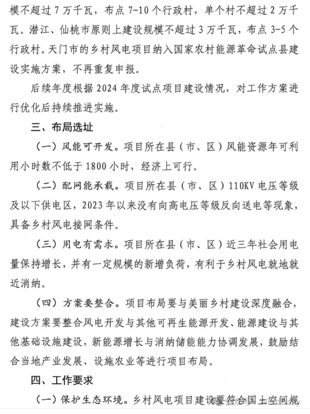 WindDaily获悉,湖北省能源局近日正式发布《省能源局关于征求湖北省“千乡万村驭风行动”工作方案意见的函》。据文件,2024年,湖北省安排100万千瓦左右乡村风电建设规模,因地制宜选择100个村先行试点。每个地市(含恩施自治州)可申报一个试点县(市、区),每个试点县(市、区)原则上建设规模不超过7万千瓦,布点7-10个行政村,单个村不超过2万千瓦。潜江、仙桃市原则上建设规模不超过3万千瓦,布点3-5个行政村。天门市的乡村风电项目纳入国家农村能源革命试点县建设实施方案,不再重复申报。在项目选址方面要求风资源可利用小时数不低于1800小时,业主优选要同一省级企业原则上只参与一个试点县项目建设,同等条件下优先考虑在所属县市投资调峰储能能力项目的企业。具体如下:
