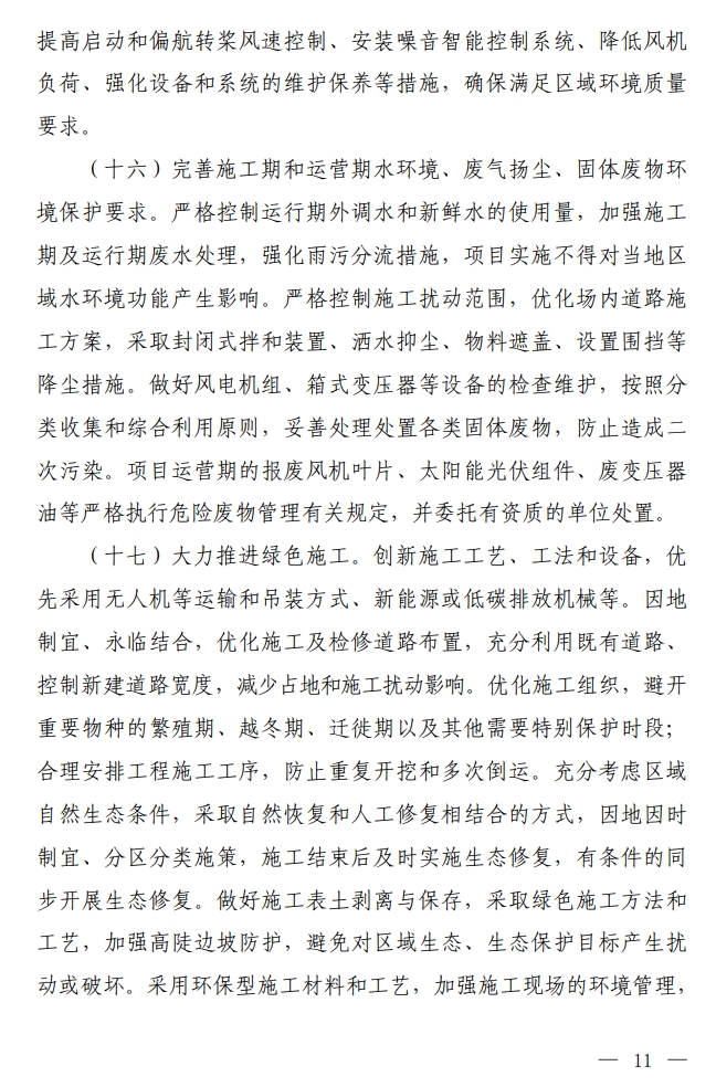 其中,在严格落实项目生态环境保护措施及要求方面明确,严格控制噪声、光影闪烁对周边居民的影响。充分考虑风电机组不同频率噪声及不同声源的叠加影响,重视风电机组光 影闪烁影响,合理优化风电场内微观选址、布局,应通过科学预测, 基于噪声、光影闪烁防护需求,新建风电项目的风机应距离周边居民、企事业单位等不得小于700米。