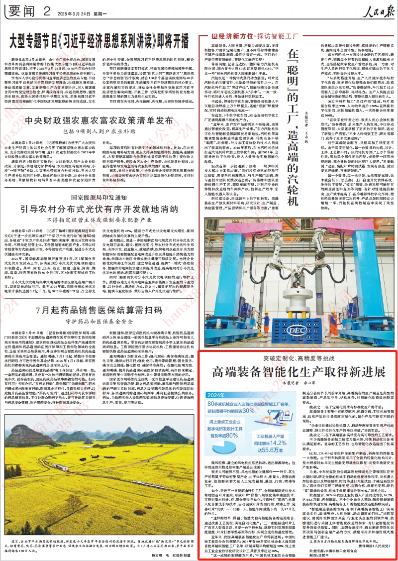 数据显示,2024年我国工业机器人产量同比增长14.2%,达55.6万套,再创新高。不少企业负责人期盼,随着智能制造装备的快速发展,高端装备工厂的智能化改造能持续突破。 “智能制造装备的发展,有利于高端装备智能工厂实现高效柔性、敏捷响应、人机协同、动态调度的目标。”刘前军建议,要更好发挥国资央企、行业龙头企业的引领作用,鼓励他们进行关键工序智能化改造的探索,为行业智能化转型升级提供借鉴。同时,加强金融支持,通过制定差别化信贷政策与创新金融产品的方式,鼓励采用多种融资模式推进智能工厂建设。