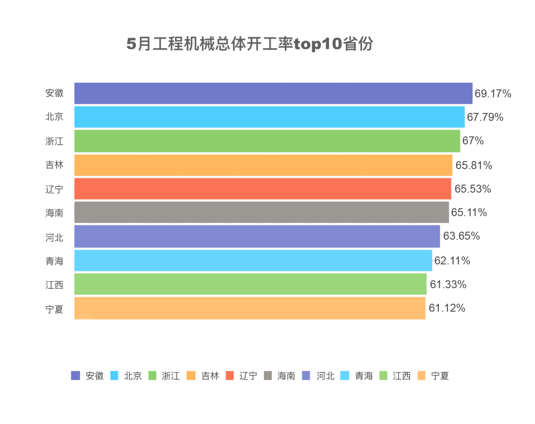 5月份,全国工程机械开工率为47.34%,综合开工率排名前十的省份是:安徽、北京、浙江、吉林、辽宁、海南、河北、青海、江西和宁夏。其中,青海开工率环比增长3.14%,环比增幅全国第一,吉林开工率环比增长2.87%,环比增幅全国第二。