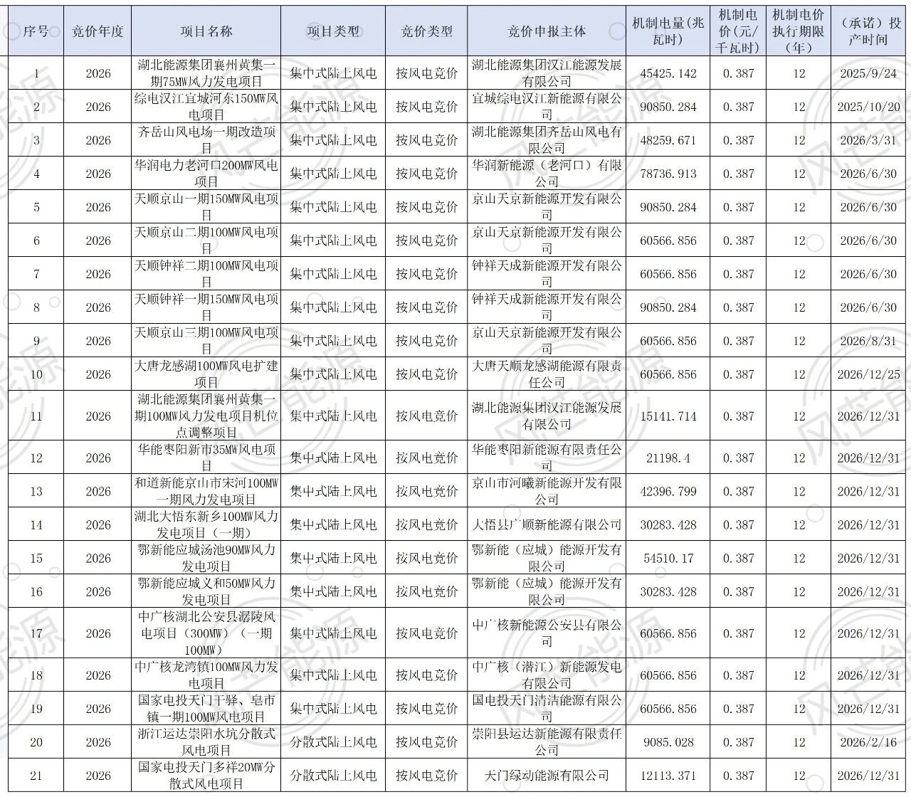 风电竞价项目竞价出清结果:机制电量规模1083952.908兆瓦时,机制电价水平0.387元/千瓦时,项目21个。