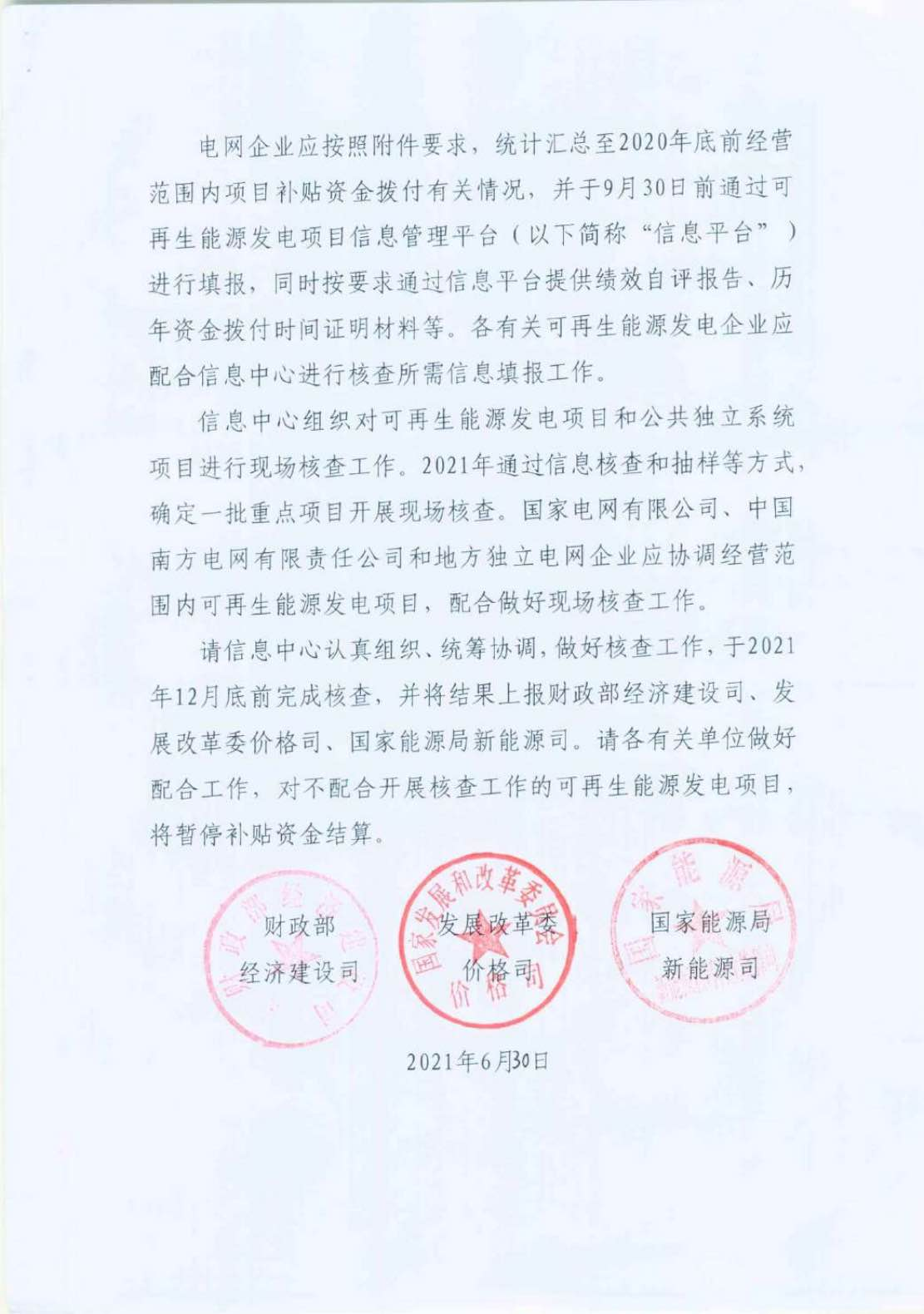 近日,国家可再生能源信息管理中心发函至各企业协助开展2021年度可再生能源电价附加补助资金核查工作。根据财政部经建司、国家发改委价格司、国家能源局新能源司联合下发的《关于开展可再生能源电价附加补助资金核查工作的通知》,国家可再生能源信息中心将对享受国家可再生能源电价附加补助资金的风电、光伏发电、生物质发电项目以及公共独立系统项目进行核查。补贴资金的及时、公平发放情况,实际并网容量与核准(备案)容量不一致等九项工作成为核查重点。