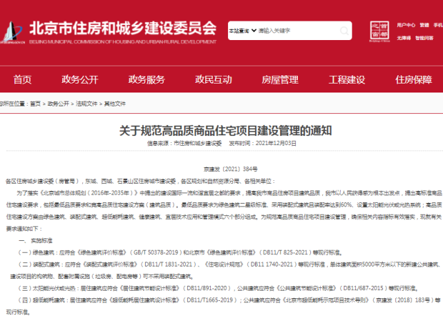 近日,北京市住房和城乡建设委员会、北京市规划和自然资源委员会联合印发《关于规范高品质商品住宅项目建设管理的通知》(京建发〔2021〕384号)。《通知》指出,为了落实《北京城市总体规划(2016年-2035年)》中提出的建设国际一流和谐宜居之都的要求,提高北京市商品住房项目建筑品质,北京市以人民获得感为根本出发点,提出高标准商品住宅建设要求,包括:最低品质要求和竞高品质住宅建设方案(建筑品质)。最低品质要求为绿色建筑二星级标准、采用装配式建筑且装配率达到60%、设置太阳能光伏或光热系统;高品质住宅建设方案由绿色建筑、装配式建筑、超低能耗建筑、健康建筑、宜居技术应用和管理模式六个部分组成。
