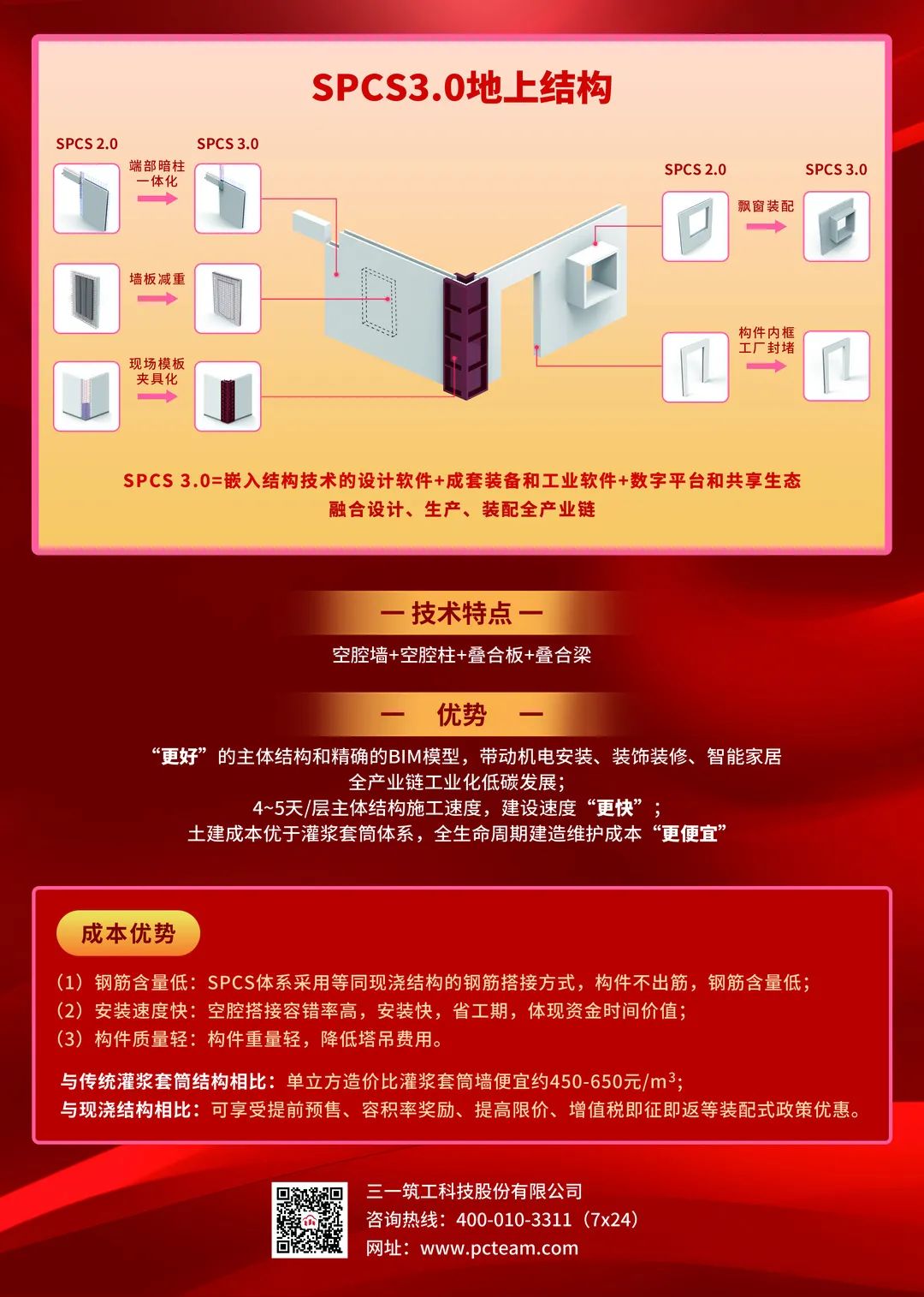 三一筑工创立于2016 年,定位为三一全预制装配式建筑解决方案(“SPCS inside”),致力于把建筑工业化,让天下没有难做的建筑。源于三一的智能制造经验和工业互联网基础,为客户提供智能装备和数字工厂、关键技术和相关标准、工业软件和共享平台,用“5231硬科技”(5 类装备、2 类标准、3 类软件、1 个平台)为行业提供“更好更快更便宜”的系统方案,推动智能建造与建筑工业化协同发展。研发的核心技术——SPCS结构技术,采用“空腔搭接加后浇,定型模具浇节点”的方式,解决行业痛点,在预制结构和地下工程防水等领域补齐装配式混凝土建筑技术体系的拼图,实现了“墙柱梁板全预制、地下地上全装配”。