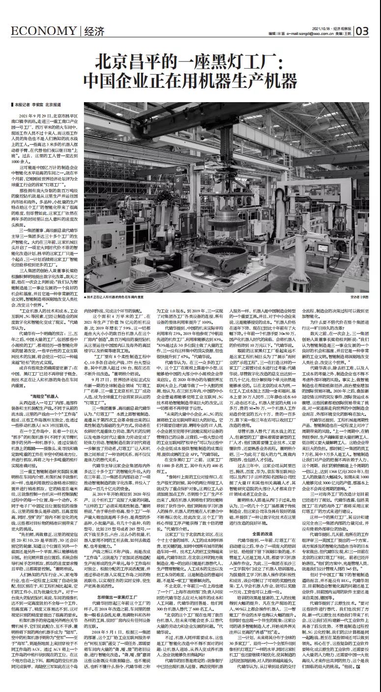 10月18日,经济观察报整版刊发文章《北京昌平的一座黑灯工厂:中国企业正在用机器生产机器》,对三一桩机工厂获评世界灯塔工厂进行深度报道。报道称:在中国,黑灯工厂已经不再停留于概念,而技术正在让人和机器的角色在车间内重置,这家工厂在两年多的时间里以出人意料的速度改头换面,成为中国亿万计的制造企业中智能化水平最高的车间之一,并将作为三一后续工厂智能化改造的起点与标杆。
