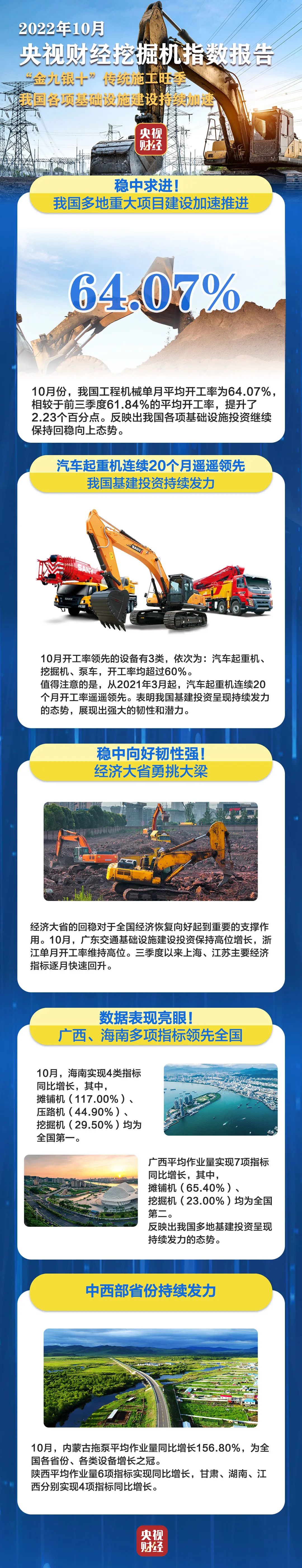 挖掘机是基础设施建设的“标配”,是反映基础设施建设、观察固定资产投资等经济变化的风向标。央视财经与三一重工、树根互联联合打造的“央视财经挖掘机指数”发布了最新相关数据。10月份我国多地重大项目建设加速推进,在“金九银十”传统施工旺季的带动下,我国基建投资呈现持续发力的态势。