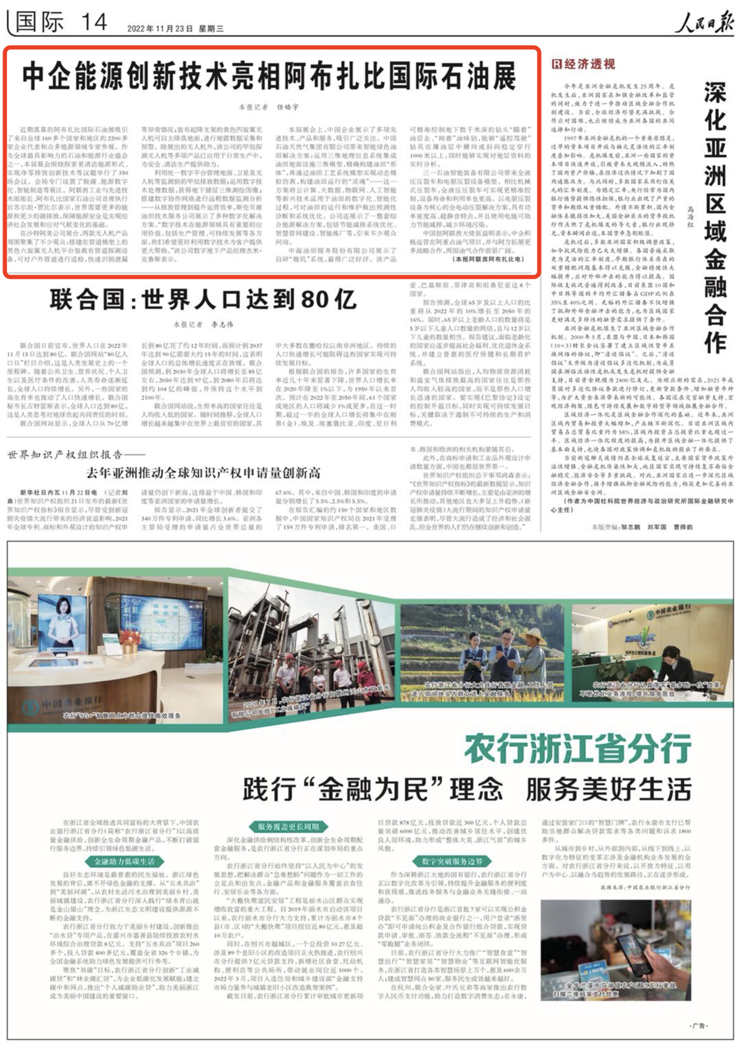 11月23日,《人民日报》在国际版面,刊发《中企能源创新技术亮相阿布扎比国际石油展》,三一石油智能装备有限公司带来全液压压裂车和电驱压裂设备模型。相比机械式压裂车,全液压压裂车可实现更精准控制,设备寿命和利用率也更高。以电驱压裂设备为核心的全电动压裂解决方案,具有功率密度高、超静音特点,并且使用电能可助力节能减排,减少环境污染。以下是原文: