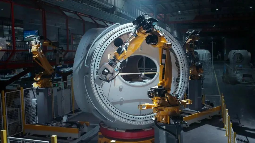 在数字化生产体系下,少人化、低能耗、零浪费是南口主机智能工厂颇具代表性的特征。不同于传统制造业车间内来往的产业工人,在三一重能的产区、生产线内,几乎很难看到工人的身影。通过机器人应用与精益化生产体系的融合,关键工序上使用智能机器人代替人工,配送与质检等工序,也均实现流程自动化,以提高生产的效率和装配质量可靠性。重量多以吨来计算的风电机组,部件庞大且工序复杂,但在三一重能的生产车间内,基于物联网建立的能源平台可以在保持设备高效率的同时,减少反复作业,提高能效;在订单的多型号混线生产过程中,行业领先的具备柔性生产能力的“脉动式”生产体系,可以实现用料精准控制、包装标准化,避免浪费。