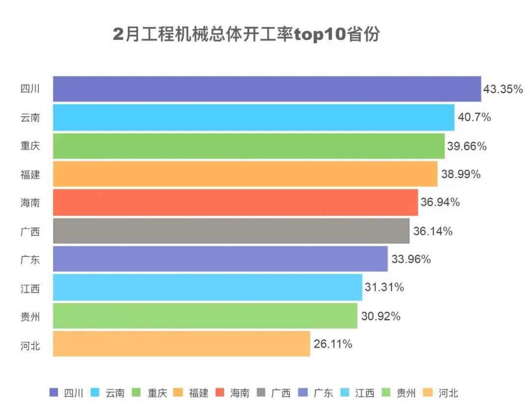 2月,受天气影响,开工率前列省份主要分布在南方。四川、云南、重庆、福建、海南为全国开工率top5省份。其中,自2023年3月起,海南省开工率一直排在全国前五。