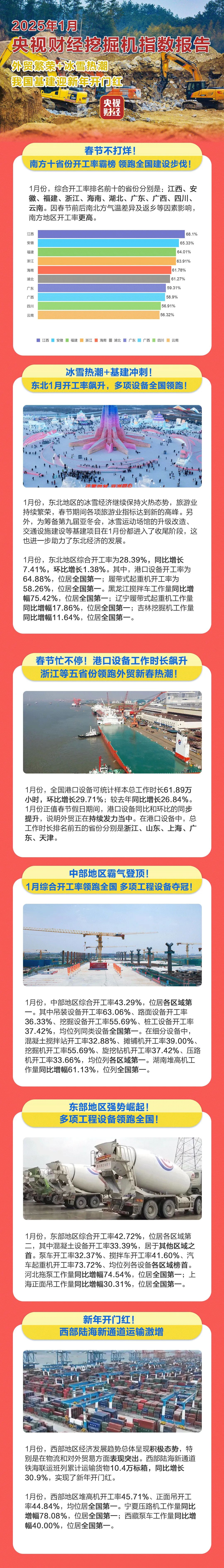 挖掘机是基础设施建设的“标配”,是反映基础设施建设、观察固定资产投资等经济变化的风向标。央视财经与三一重工、树根互联联合打造的“央视财经挖掘机指数”发布了最新相关数据。1月份,虽然受春节节假日临近、企业员工集中返乡等因素影响,全国各项基建项目逐渐放缓,但受冰雪经济和外贸交易带动,多地和多类机械设备开工率上涨。