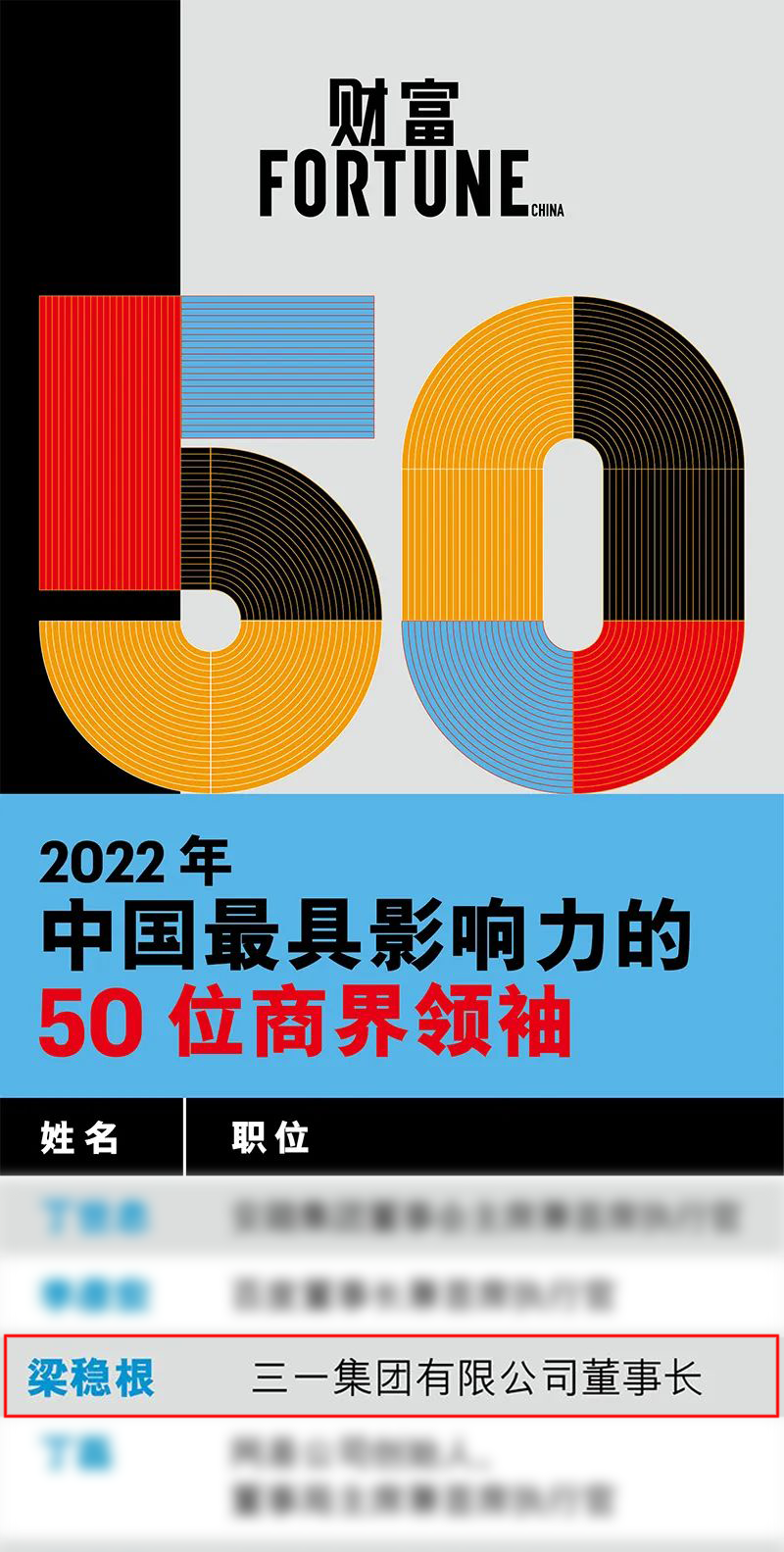 4月8日,财富2022年中国最具影响力的50位商界领袖榜单发布,三一集团董事长梁稳根先生获评。