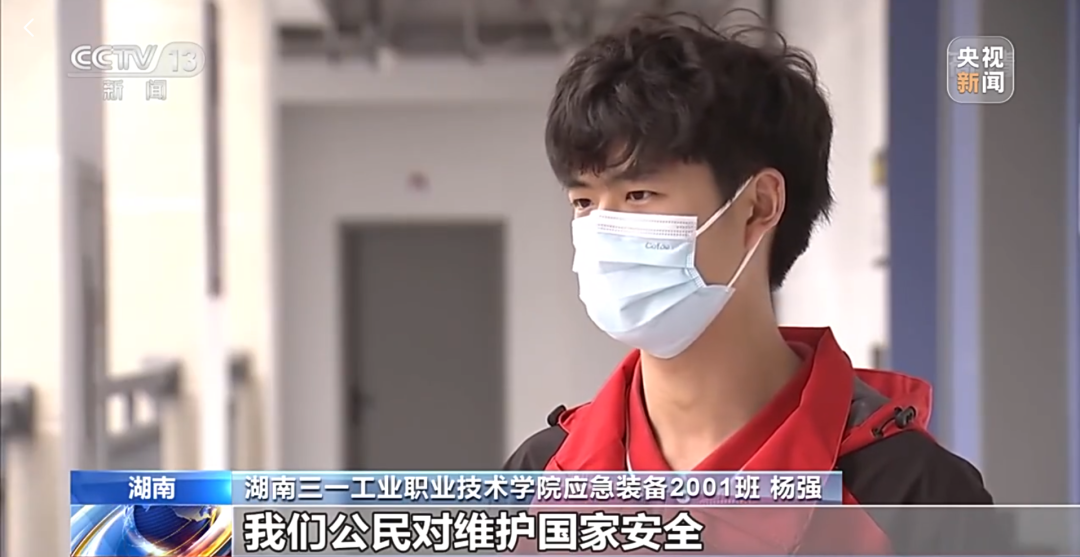 在接受央视记者采访时,三一工学院应急装备2001班杨强说:“我们公民对维护国家安全都有自己的责任和义务,对我们来说国家安全人人有责。”