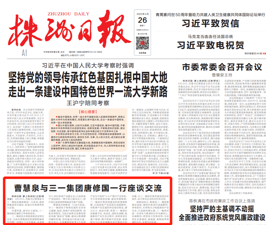 4月25日,株洲市委书记曹慧泉与三一集团总裁唐修国一行座谈,就加快推进项目建设、拓宽合作领域等深入交流。