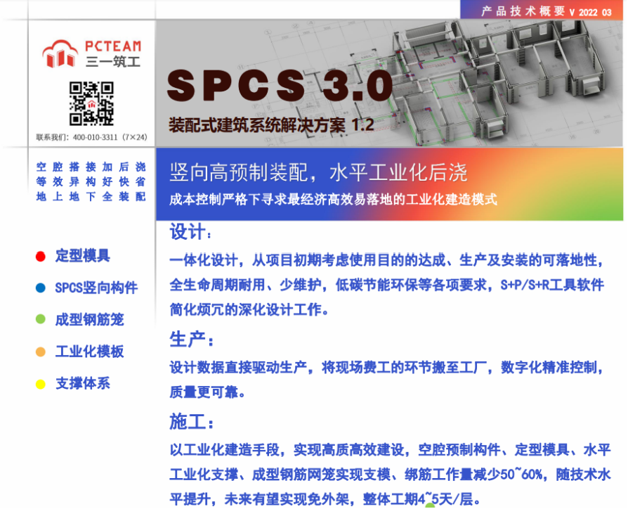 2、SPCS系统方案应用SPCS+P/N/R设计软件,实现智能拆分和深化设计;SPCI-PMES/RMES/CPTS自主工业软件解析构件三维数据,驱动工厂生产;PCM管理软件和驾驶舱、一件一码全管控;PCTEAM“全周期、全要素、全角色”项目管 理平台替代进口;建筑设计、生产、施工全过程的数字孪生交付,为后续建筑运维提供数据支撑;三一利用在工程领域长期积累的技术优势,实现SPCS方案在智能化技术应用、装配化施工、新技术应用等计满3分。