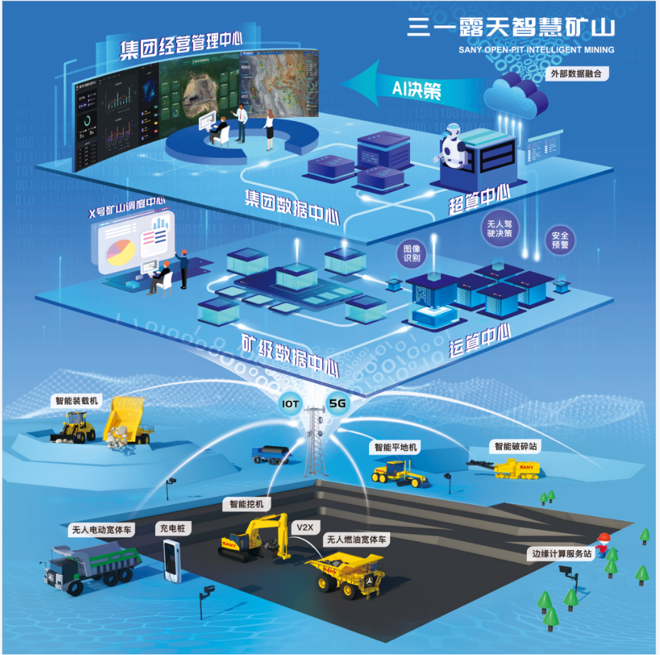 在国家“双碳”目标的大背景下,三一智矿提出“数字矿山、绿色矿山、智慧矿山”的核心理念,打造了集智能化设备、智能网络、动态监控、 数据挖掘、运营管理于一体的智慧矿山整体解决方案。