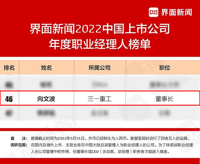 近日,界面新闻发布2022中国上市公司年度职业经理人榜单,三一重工董事长向文波榜上有名,连续四年蝉联“上市公司年度职业经理人”称号。