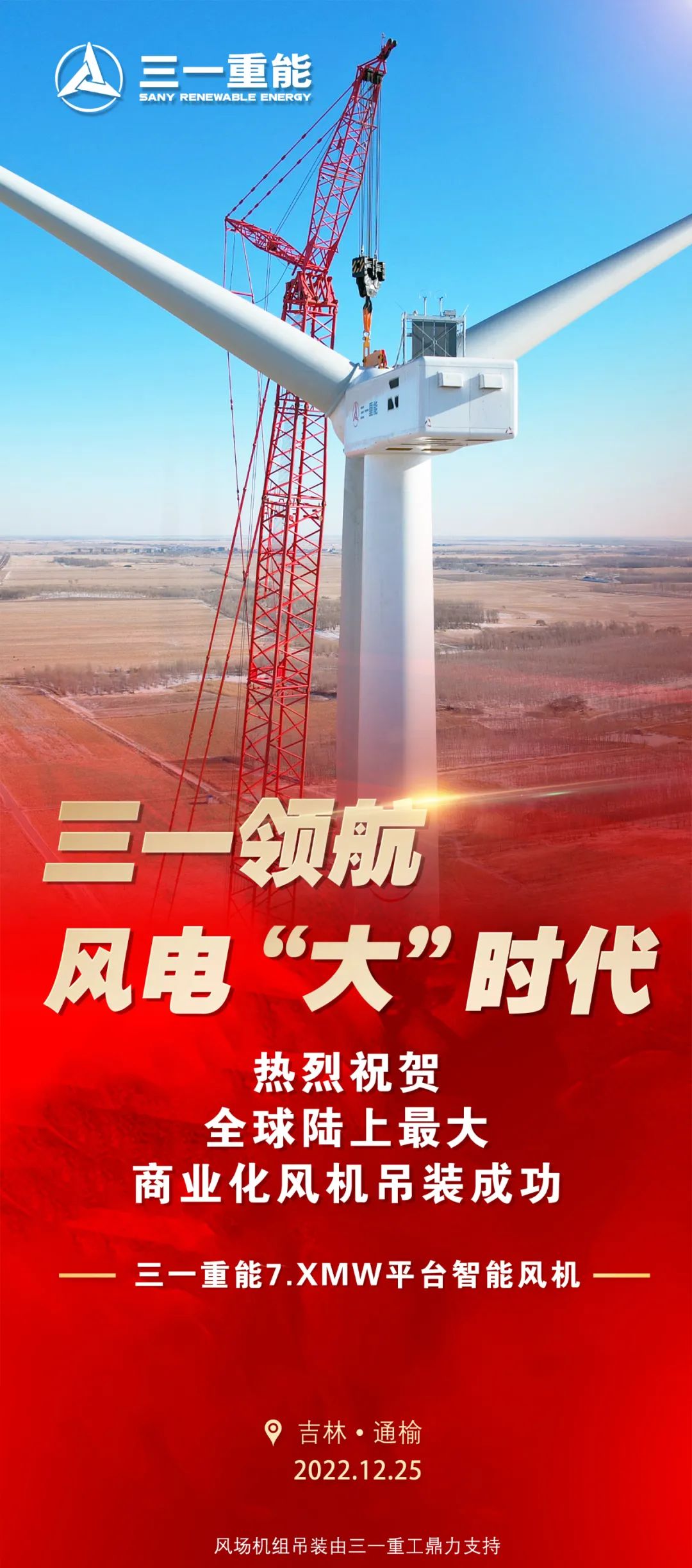 东北黑土地,见证了中国风电一大里程碑时刻。近日,在吉林通榆,三一重能7.XMW平台首台风电机组成功完成吊装。三一重能率先将7.XMW陆上风机商业化应用,创下全球陆上最大商业化风机新纪录。该风场总容量100MW,全部采用三一重能7.XMW平台风电机组,将成为全球首个单机7.XMW风机批量商业化陆上风场。