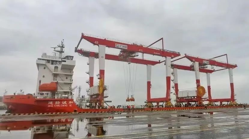 广州港,由三一海工承制的首批2台远控重箱轨道吊落轨,未来还将有10台这样的高端设备来到这里。