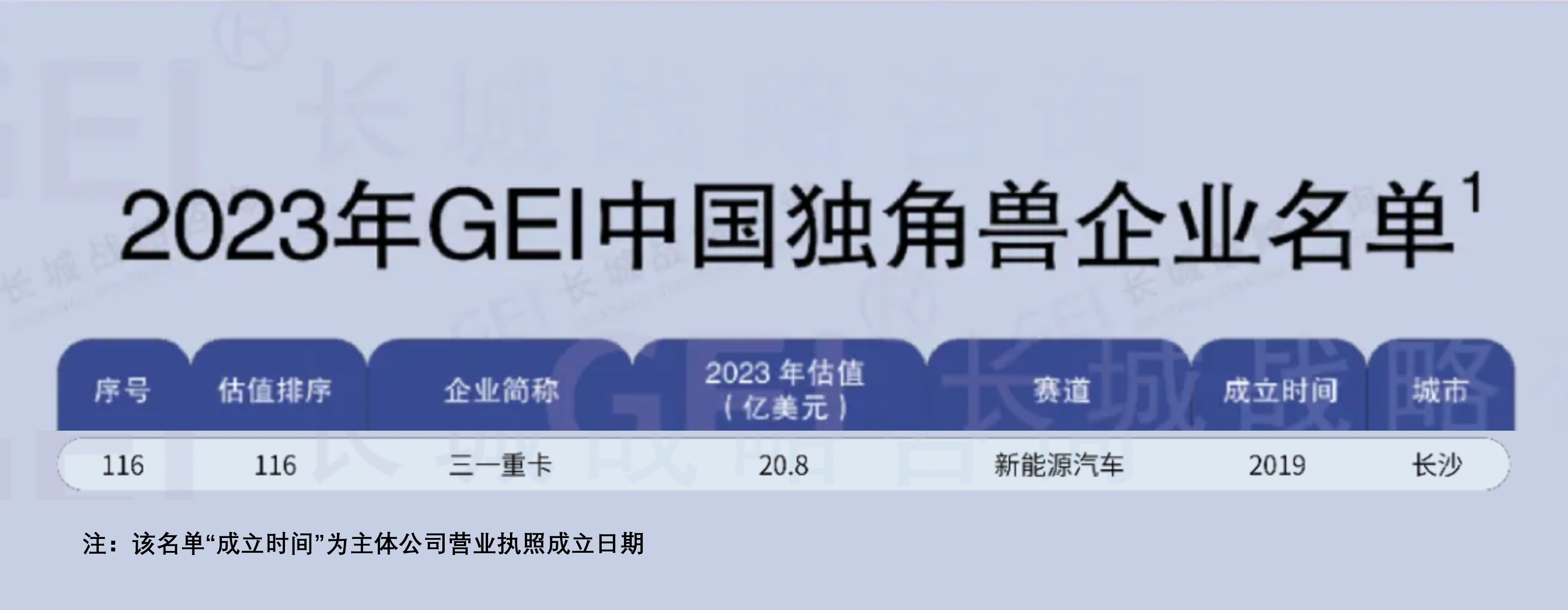 近日,在2024中国(重庆)独角兽企业大会上,长城战略咨询发布《中国独角兽企业研究报告2024》。报告显示,2023年中国独角兽企业共375家,其中,三一重卡以20.8亿美元的估值排行在榜单第116位。