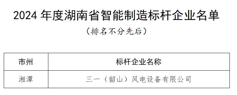 近日,湖南省工业和信息化厅发布了2024年度湖南省智能制造标杆企业和标杆车间名单,三一(韶山)风电设备有限公司荣登“2024年度湖南省智能制造标杆企业名单”。