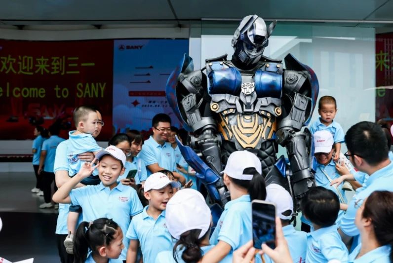 宁乡园区三一重起灯塔工厂前“擎天柱”与孩子们互动
