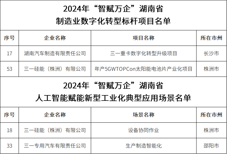 近日,湖南省工业和信息化厅发布2024年“智赋万企”湖南省制造业数字化转型标杆项目名单及人工智能赋能新型工业化典型应用场景名单,三一共4个项目入选,引领行业数智化升级。