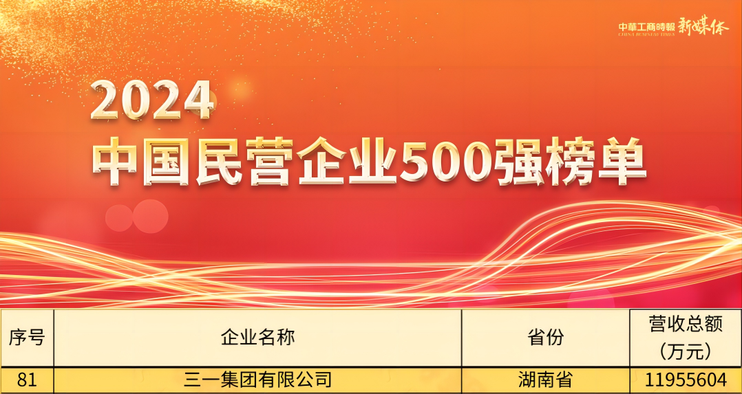 榜单显示,三一集团位列“2024中国民营企业500强”第81位,同时荣膺“2024中国制造业民营企业500强”第54位。