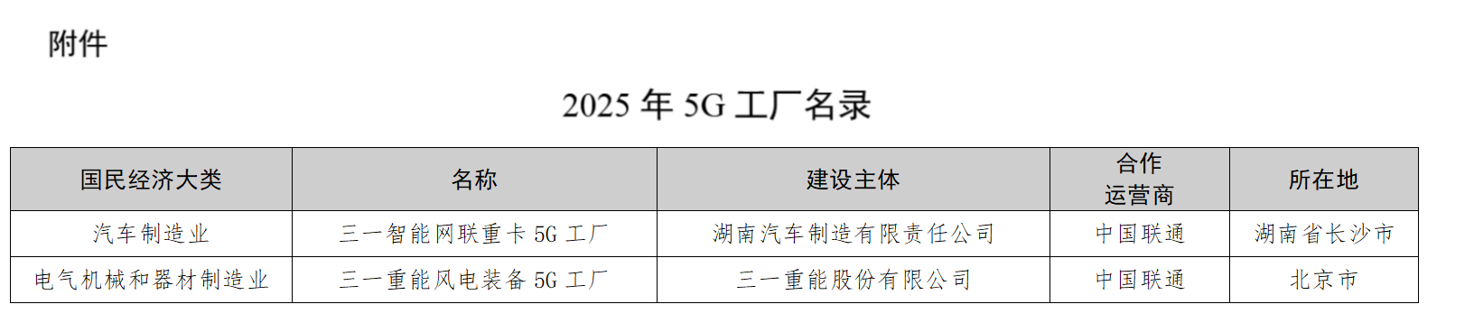 在此次入选的项目中,三一集团两家工厂成功上榜。其中,三一智能网联重卡5G工厂入选汽车制造业大类,三一重能风电装备5G工厂入选电气机械和器材制造业大类,充分彰显了三一在多领域推进5G+智能制造的领先实力。