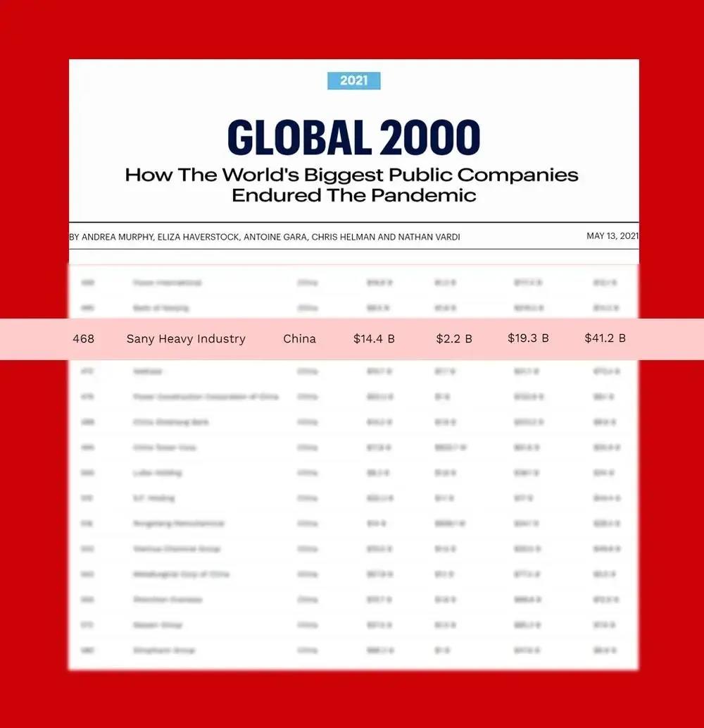 2021年5月13日,《福布斯》发布2021年全球企业2000强榜单。三一重工排名总榜单第468位,首次跻身全球企业500强,排名较去年大幅上升235位,是榜单中排名中国第一、全球第二的工程机械企业,也是中国行业第一家《福布斯》全球500强。