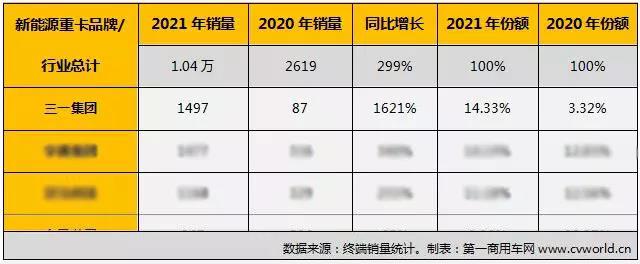 根据第一商用车网掌握的最新数据,2021年,三一累计销售1497辆新能源重卡,占据14.33%的市场份额,夺得国内新能源重卡年度销量冠军。