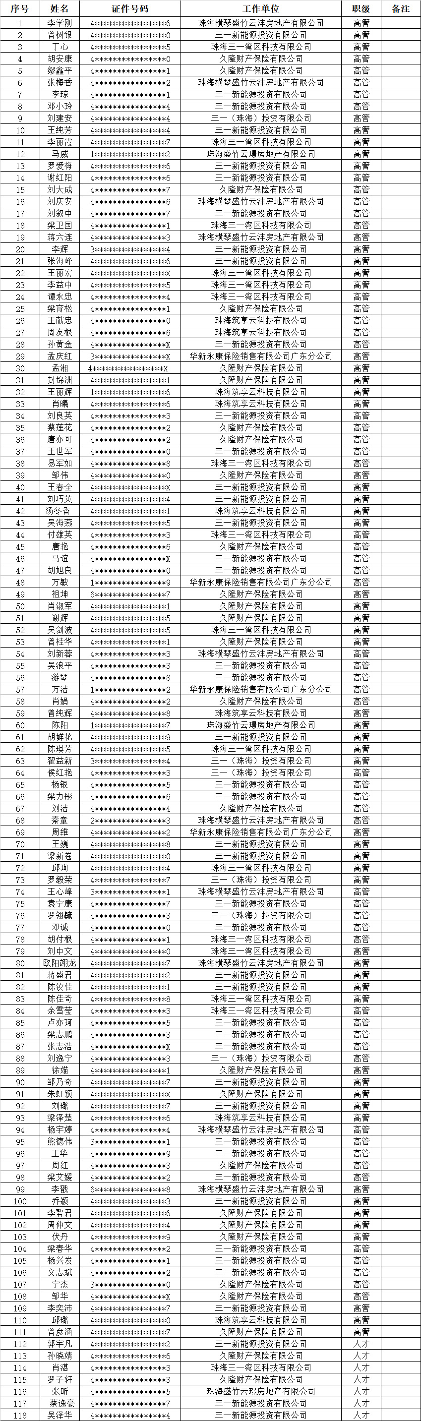 为增加员工归属感,我司开发位于珠海市金湾区平沙镇铭恩路31号【三一蓝海花园项目】用于引进行业人才,为保障房住不炒的居住用途及员工购房资格合规性,根据我司制定的《关于三一蓝海花园购房资格管理办法》,现对项目购房名单做如下公示: