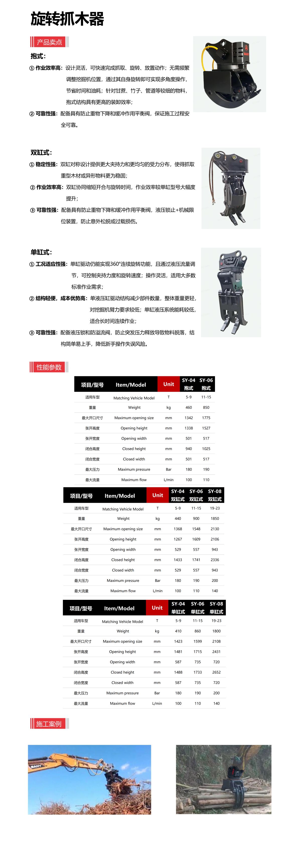 ① 作业效率高:设计灵活,可快速完成抓取、旋转、放置动作;无需频繁调整挖掘机位置,通过其自身旋转即可实现多角度操作,节省时间和油耗;针对甘蔗、竹子、管道等较细的物料,抱式结构具有更高的装卸效率;
